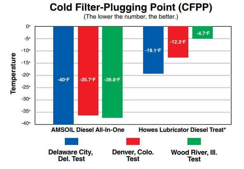 Lors d’essais indépendants, le AMSOIL Diesel All-In-One offre une protection jusqu’à 32°F supérieure à la protection contre la gélification du carburant diesel par temps froid par rapport à Howes Lubricator Diesel Treat*. Vous savez – Howes, l’une des plus grandes entreprises d’additifs pour carburant diesel aux États-Unis.